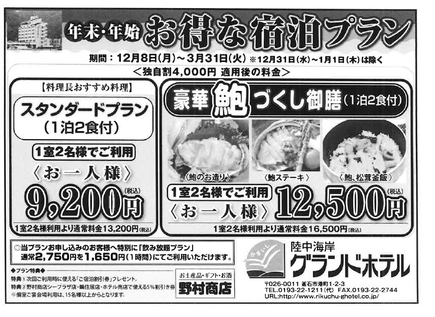 「年末年始 お得な宿泊プラン」をご用意いたしました。この機会にぜひご利用ください。